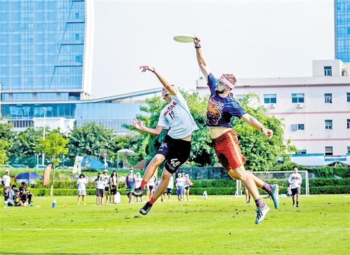 外国友人在观澜湖新城的草地上进行体育竞技。