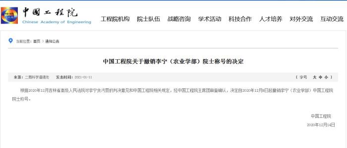 中新网1月11日电 据中国工程院网站消息,根据2020年12月吉林省高级人民法院对李宁贪污罪的判决意见和中国工程院相关规定,经中国工程院主席团审查确认,决定自2020年12月8日起撤销李宁(农业学部)中国工程院院士称号。