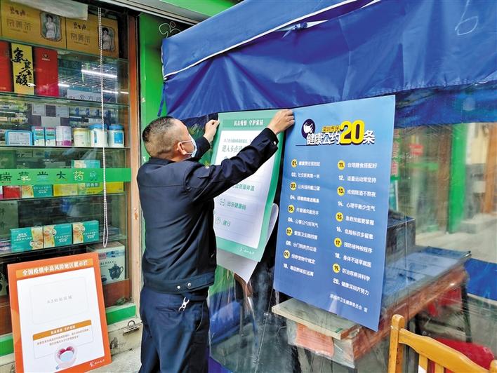 福城街道网格员在辖区张贴防疫宣传海报。
