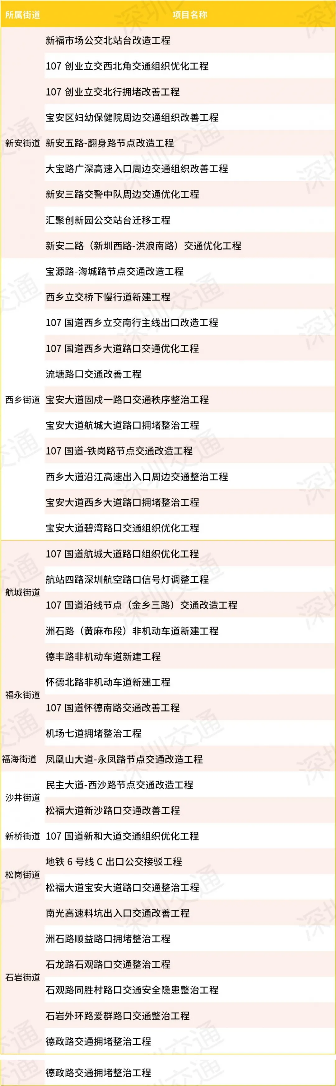 上面你们看到的 只是冰山一角 这次交通综合整治 不光是「治堵」这么简单! #小型交通综治项目 对于小型交通综治项目,市交通运输局宝安管理局简化了审批流程,无需申报立项,可以快速实施,即刻有效地解决城市交通痛点。 小型交通综治项目内容主要包括:整治交通拥堵点和交通事故黑点,完善片区交通微循环,完善公交设施、片区慢行设施、停车设施,增设监控设施、完善标志标线等。 #“进度君”有话说 截至目前,共开展5批次共40个项目。按街道划分,新安9个、西乡11个、航城4个、福永4个、福海1个、沙井2个、新桥1个、松岗2个、石岩6个。 据显示,小型综治项目实施以后,各点位交通运行效率均提升了8%至15%不等,极大改善了交通拥堵状况,消除了交通安全隐患。
