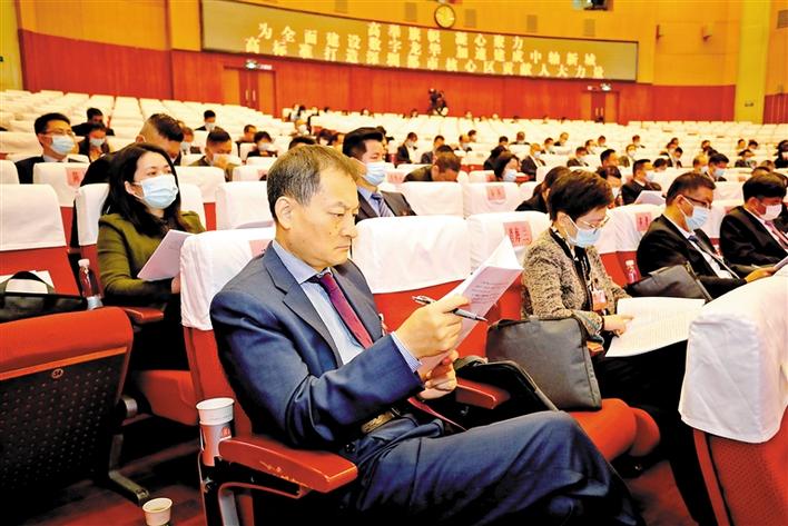 区人大代表在区一届人大六次会议开幕大会上认真阅读会议材料。