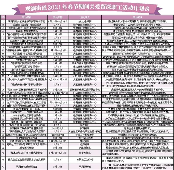 本次定位打卡活动仅仅是观澜街道春节主题系列活动的一个缩影。据悉,观澜街道把服务保障好留深过年人员作为春节期间重要工作,将通过“线上+线下”的形式组织开展新春文化活动共40余场,惠及全体职工,全方位营造浓厚的春节氛围。其中,“留深不孤单·甜蜜过新年”观澜街道新春青年线下联谊会将在大年初三当天举办,为广大在观澜工作生活的单身青年牵线搭桥,寻找到自己的幸福。与此同时,春节期间观澜街道各个社区也将有针对性地开展有品质、有特色、接地气的各类主题活动,例如,在线上开展答题赢话费、线下开展写对联、猜灯谜等形式多样的趣味活动,增强留深过年人员“就地过节”的幸福感,度过一个欢乐、温暖、暖心的春节。