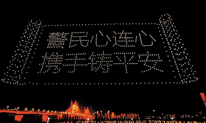 《忠诚铸伟业·阔步新征程》由中宣部和公安部主办,中央广播电视总台承办,旨在庆祝第一个中国人民警察节,致敬人民警察。演出中,大漠大操纵1000架无人机组成无人机编队,配合晚会节目《英雄》,在武汉江滩进行无人机编队灯光表演。伴随着《英雄》的歌曲,无人机编队在空中构成人民警察警徽、“您好110”、“警民心连心、携手铸平安”等兼具艺术性和科技性的编队画面,同时配合灯光变化,为武汉两江四岸的市民百姓和全国的电视观众呈递了一场完美、惊艳的无人机编队灯光表演。
