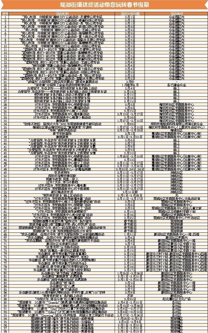 龙华新闻讯(记者 徐蔚昕 通讯员 罗国升)包饺子、送门票、有奖问答、拍照打卡……98项活动汇聚成的新年“盛宴”,让您留深过年更够“味”。记者从观湖街道获悉,在观湖街道党工委、办事处的精心部署下,观湖街道启动了“牛年新春送大礼”关爱留深职工系列活动(详见右表),坚持线上为主,线下为辅的活动形式,让广大留深职工在观湖感受到家的温暖。活动预计惠及职工群众5000余人次。