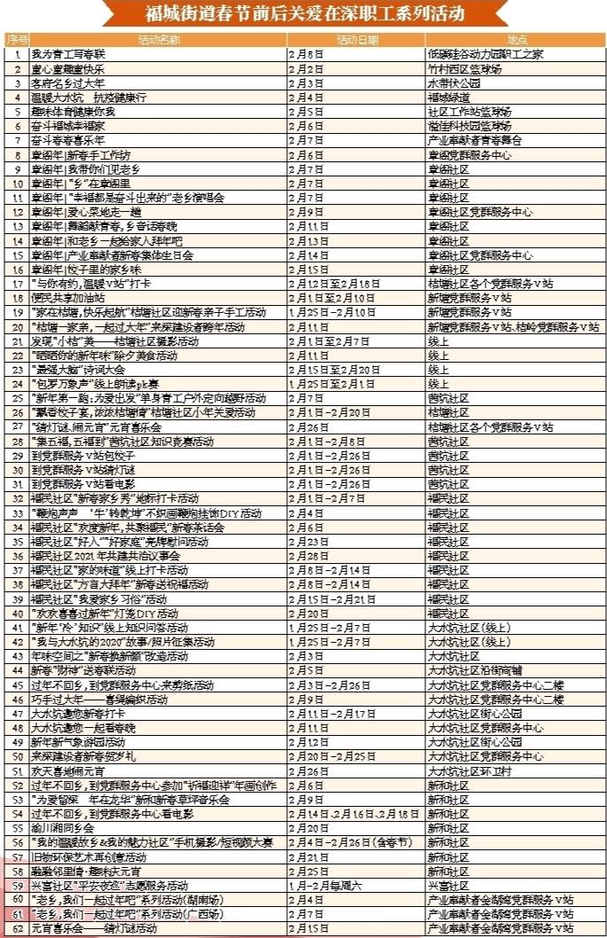 福城街道总工会有关负责人表示,62项活动将覆盖辖区7个社区,来深建设者可结合自己的安排,选择合适的时间地点参与到活动中来,享受福城“关爱大礼包”。