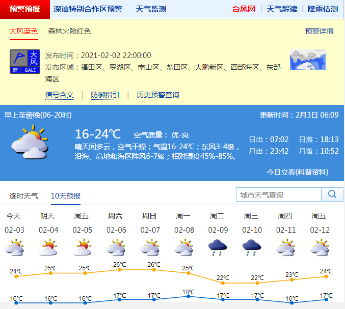 深圳市气象局预计2日夜间到3日多云间晴天,气温16-24℃,沿海、高地和海区有6-7级阵风;4-6日晴天到多云,早晚有轻雾,部分时间能见度较差。7-8日云量增多。3日天气干燥,风力大,请注意防火防风。