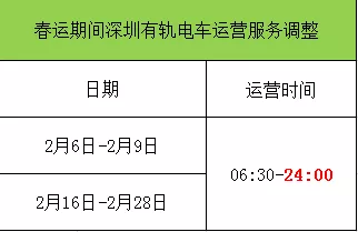 资料图。 @龙华的小伙伴经常搭乘现代有轨电车的注意啦! 春节前后共有17天,每日运营服务时间将延长1小时。 具体调整: 2021年全国春运自1月28日起至3月8日止,共计40天,其中节前15天。节后25天,春节放假时间为2月11日(除夕)——2月17日(初六)。 为满足2021年春运期间广大市民的出行需求,深圳有轨电车将于2月6日—2月9日、2月16日—2月28日,共计17天,延长运营服务时间1小时。 小编提醒广大市民乘客:请大家注意查看电车的运营时间及区段,提前做好出行规划如有需要可致电咨询现代有轨电车工作人员0755-36861531。 此外,由于疫情原因,今年留深过年人数或超过1800万,希望市民乘客在出行时配合我们的工作人员,共同做好疫情防控工作~ 祝您在深圳过个健康、平安、幸福的新年! 素材来源:龙华现代有轨电车&综合网络