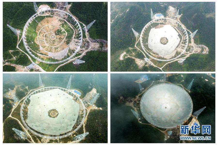 这是一张拼版照片,左上为FAST项目拼装第一块反射面板(2015年8月2日摄)、右上为FAST反射面板安装近半(2015年12月16日摄)、左下为FAST项目反射面板安装近八成(2016年3月9日摄)、右下为FAST项目反射面板安装完成(2016年7月3日摄)。
