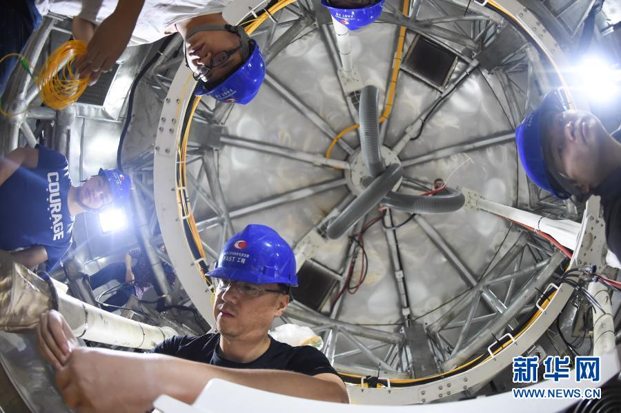 这是2017年8月10日,工作人员在FAST馈源舱内工作(检修期间拍摄)。