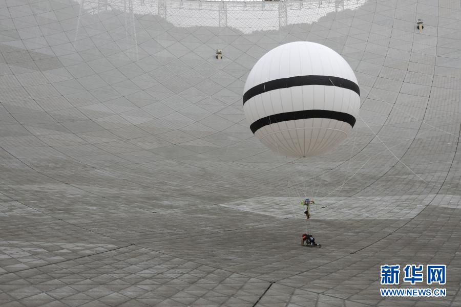 2019年8月30日,工作人员在FAST反射面板上实验“微重力蜘蛛人”方案。
