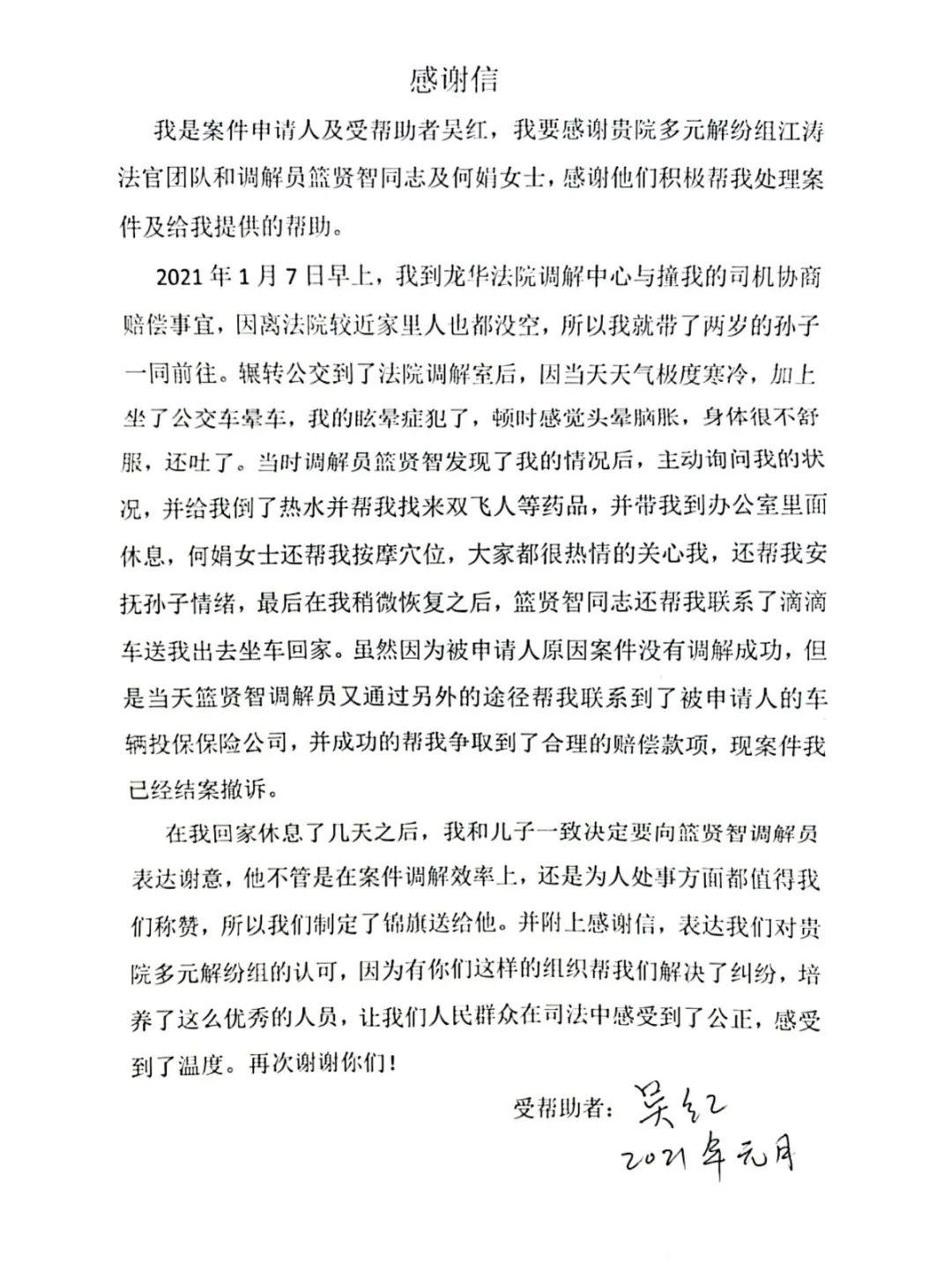 吴老太太身体恢复后,调解员篮贤智主动为其联系出租车,送吴老太太和孙子二人到法院门口坐车回家,并垫付车费。
