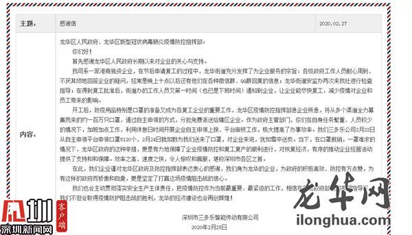 2月27日,企业通过龙华书记信箱写来的感谢信。