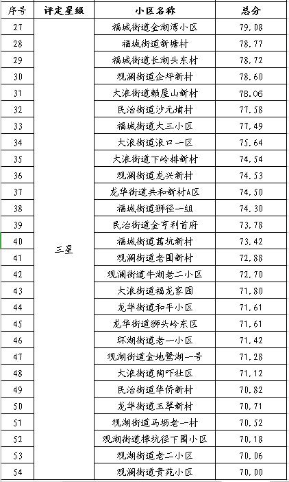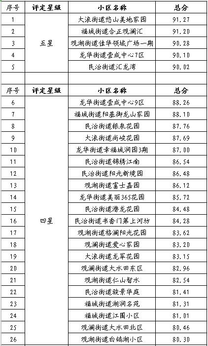近期,区委政法委联合第三方机构进行了验收评定,按照《龙华区安全文明小区星级创建和动态管理实施方案》37项创建指标,通过实地检查、问卷调查、随机回访和依托相关职能部门提供日常管理数据等方式,经客观数据计算和综合评分,从62个申报评选的小区中严格评定出54个星级安全文明小区(五星级小区5个、四星级小区21个、三星级小区28个,具体名单附后),现向社会进行公示。