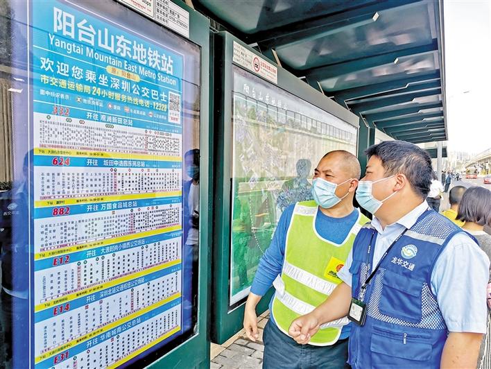 春节期间,汪新建(右一)在阳台山东地铁站公交站台了解客流情况。