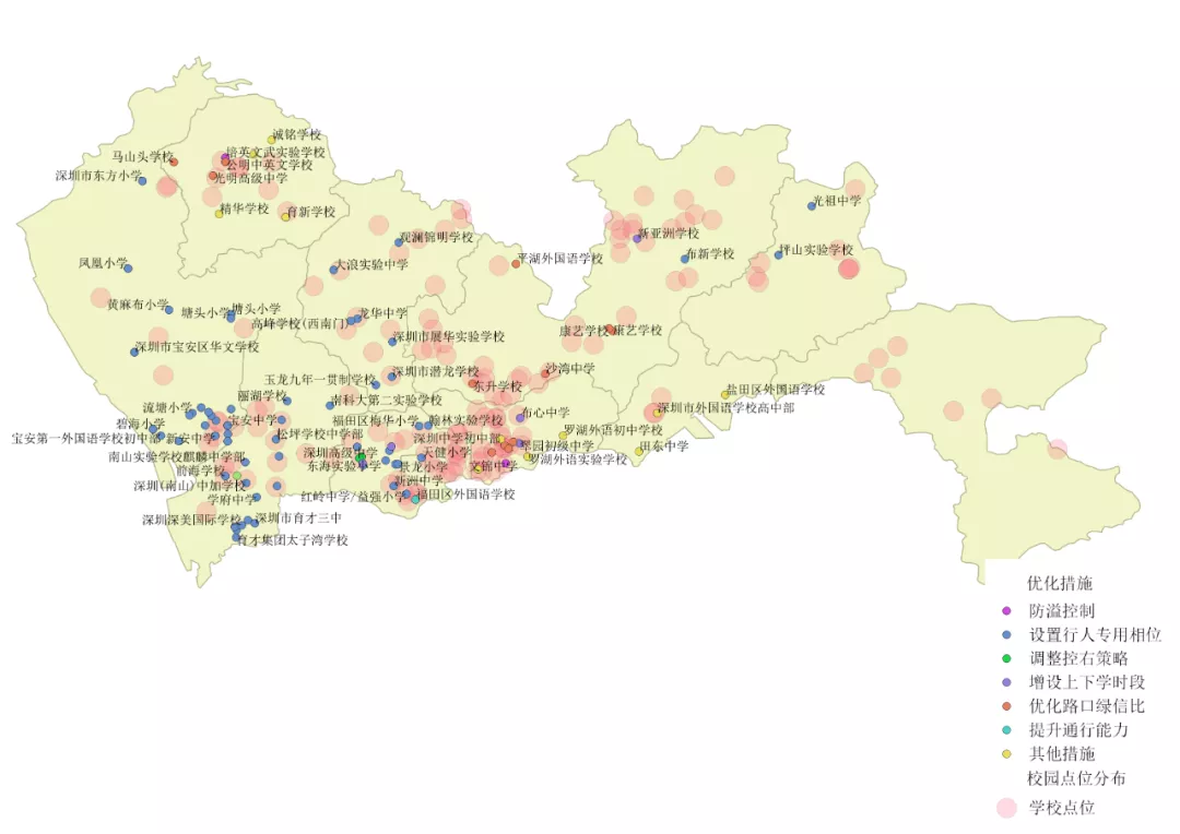 各位家长请注意,各位家长请注意 2021年春季学期就要开始啦 下周一(2月22日) 全市中小学和幼儿园的“神兽”们 也陆续返校啦 开学季来了 “开学堵”还会远吗?! 根据往年数据分析,预计2021年春季开学第一天(2月22日)全市早高峰时段道路交通运行指数将有所上升,道路交通较普通工作日通行压力有所增长,其中,福田、罗湖、南山、龙华区预计交通运行处于缓行状态。 注意!周一早高峰期间将有 超100万辆车上路行驶! 全市中小学、幼儿园周边的 信控路口及相关路段 将迎来上下学期间人车流量激增 预计明日(2月22日)全市路网将于7时30分前后进入缓行状态。其中,中心城区在8时至9时时段内交通运行拥堵情况较为明显,预计通行时长较普通工作日需多花费30%。 早高峰时段,预计南头、清水河、布吉、东晓、园岭、南湖等街道片区较为拥堵。 如何错开高峰、避开拥堵? 蜀黍建议市民提前掌握路况 合理调整出行时间 错峰出行、绿色出行 当然,为了确保道路安全通畅 交警蜀黍早已准备就绪! 针对校园周边信控路口 开展信号配时专项保障 确保开学后校园周边信控路 交通运行的安全与高效! 红绿灯 开学前,蜀黍对全市中小学、幼儿园周边的路口进行了梳理排查,结合历史开学交通特征及疫情期间交通影响,对全市范围内符合条件的信控路口制定了全面的配时预案。组织工程师对校园周边路口的设施设备进行了检查,确保交通设施设备正常运行;开学当天,蜀黍还将实时关注路口运行情况并进行微调。 ▲配时保障策略 ▲开学的初、高中学校周边信控路口点位图 01 调整路口控制模式 针对部分寒假期间人车流量较少,暂未达到《道路交通信号灯设置与安装规范》(GB14886-2016)规定的信号灯设置条件,而采用黄闪控制的路口,将其上放学时段的控制模式由黄闪调整为多时段定周期控制,利用红绿灯调度人车通行权。如:景田/景田北一街路口。 02 调整右转控制策略 对校园周边右转车辆与行人交织严重的路口,调整上放学时段右转控制策略,由假期期间的圆饼红灯允许右转调整至箭头红灯禁止右转,从时间上分离人车通行。 03 优化行人过街信号相位 针对多个方向行人过街流量皆较大、二次过街岛驻足空间不足等情况,通过设置行人专用相位、将行人二次过街信号调整为一次过街信号,避免二次过街岛溢流等措施提升行人过街安全和便利。 04 优化绿信比提高通行能力 开学首日,校园周边人、车总体流量上升,容易出现车辆排队现象,蜀黍将根据该路口车流量与人流量的时段变化优化相关路口绿信比并增大周期运行时间,以满足各个方向的道路通行能力,疏导排队车流。 05 突发情况及时疏解 久违的开学首日,家长纷纷接送孩子上下学,校园周边路口的临时停靠车辆容易影响道路畅通,蜀黍将在开学首日及时进行人工干预疏导排队车辆。 除此之外 深圳交警还将采取相关措施 01 疏、导、管、控 对重要道路加强巡逻管控 加强在全市主要道路、各学校周边重要道路的巡逻管控,对校门口处在交通繁忙路段的学校,定人定岗进行路面指挥疏导。 02 排查交通隐患 检查家长、学生头盔佩戴情况 为进一步消除家长骑电动车接送学生不戴头盔交通安全隐患,交警将到各辖区学校排查交通隐患,检查家长骑电动车送小孩上学头盔佩戴率情况,对佩戴率偏低的学校进行走访,向学校通报相关情况,督促学校整改。 03 安全大检查 开展校车整治行动 开学在即,为切实做好新学期校车安全检查工作,强化校车源头管理,消除各类安全隐患,近日,深圳交警联合各辖区教育局对全市校车进行安全专项检查,为返校学生出行安全保驾护航。对查处到的问题校巴,一律进行曝光。 确保交通安全有序 让家长放心接送孩子上下学 深圳交警在行动 但各位家长,你们也有一项 十分非常特别极其重要的任务要完成哦 这项任务,事关孩子的安全 搭乘、骑行电动车时戴头盔 家长骑车带孩子出行时 要严格遵守“一戴两不” 即戴头盔、不闯灯、不逆行 头部是人体最脆弱也是最容易受到致命伤害的部位,一旦发生事故,头部受到撞击后容易出现颅骨骨折、颅内出血等危及生命的情况,在电动自行车交通事故中,不戴头盔的致死率远远高于其他因素。 ▼正确做法戳下图▼ 在有交通信号灯的路口,要按照信号灯指示通行,下车推行、走斑马线,不要为了图一时之快闯灯、逆行。 乘车时使用安全椅(带) 乘车时应让孩子使用儿童安全座椅,不能怀抱孩子或让孩子坐副驾驶座:未满12周岁的孩子乘坐私家车时,应当坐在后排位置,并正确使用儿童安全座椅。 儿童乘坐小汽车 需要根据身体成长不同时期的 身高、体重和年龄 分四个阶段选用安全座椅或者安全带 足龄的学生需要正确系上安全带:安全带要尽量系在髋部和胸前,从肩上拉过来,横跨在骨盆和胸腔之上,形成一个水平放置的V字。只可一个人使用,严禁多人共用。 不让孩子的身体伸出窗外:车辆在行进的过程中,伸出窗外的身体部位很可能会与旁侧的树枝、交会的车辆以及其他车外物体发生擦碰,造成危险。 下车务必检查车厢内情况:不要将孩子遗忘在车内,哪怕只是离开车辆两分钟。 识盲区、远离盲区 盲区是驾驶人视野到达不了的地方,无论在行驶还是停车过程中都时刻存在,认识盲区更要学会避开盲区:当发现有大型车辆临近时,要尽量远离,保持3米以上的横向距离,避
