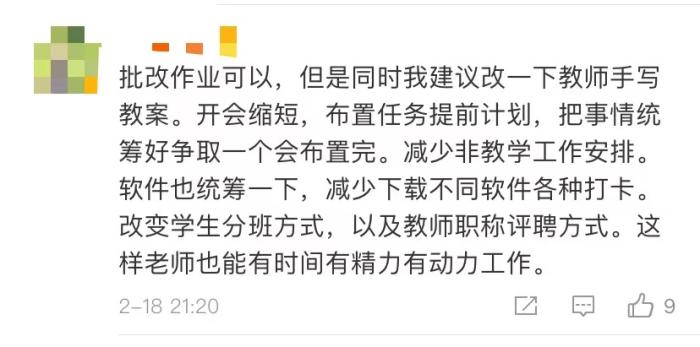 “批改作业可以,但是同时我建议一下教师手写教案,开会缩短,减少非教学安排……”