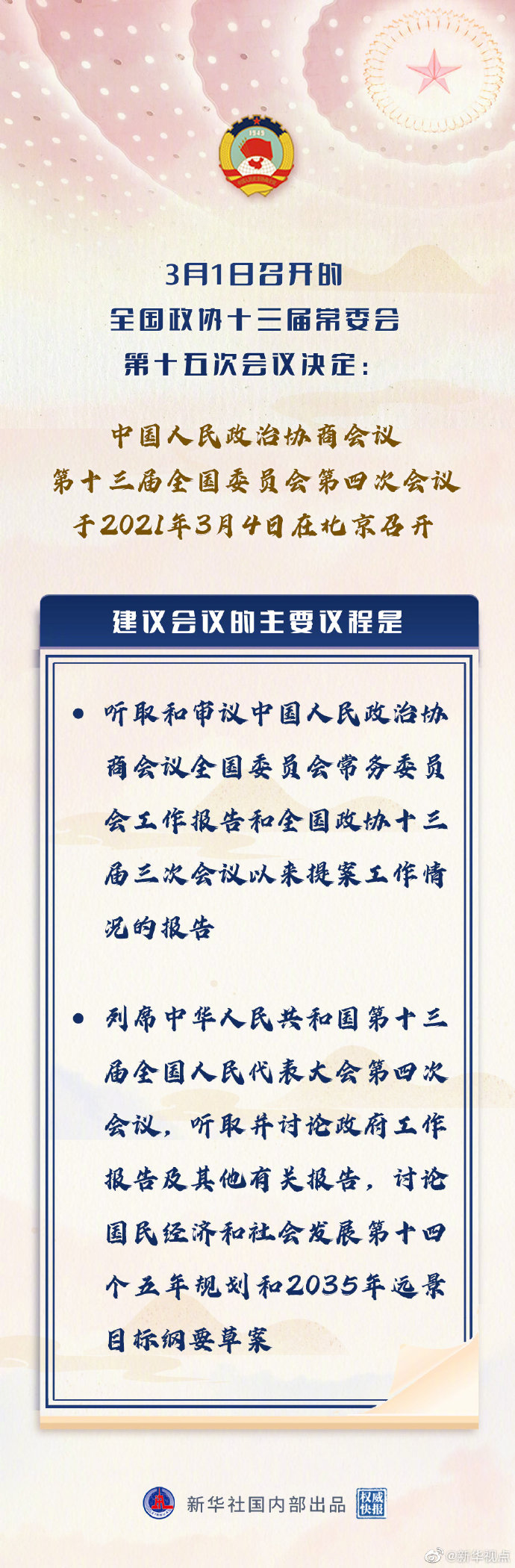@新华视点 2021年3月1日消息,3月1日召开的全国政协十三届常委会第十五次会议决定:中国人民政治协商会议第十三届全国委员会第四次会议于2021年3月4日在北京召开。建议会议的主要议程是:听取和审议中国人民政治协商会议全国委员会常务委员会工作报告和全国政协十三届三次会议以来提案工作情况的报告;列席中华人民共和国第十三届全国人民代表大会第四次会议,听取并讨论政府工作报告及其他有关报告,讨论国民经济和社会发展第十四个五年规划和2035年远景目标纲要草案。