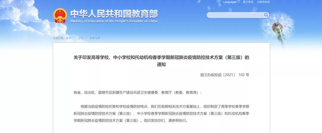 2月26日,教育部联合国家卫生健康委印发《高等学校春季学期新冠肺炎疫情防控技术方案(第三版)》。其中明确:开学之后,符合接种要求的师生依法依规、知情同意、自愿接种新冠病毒疫苗。