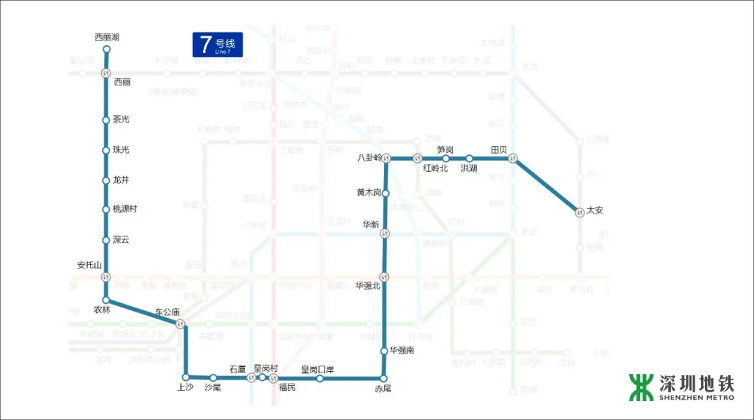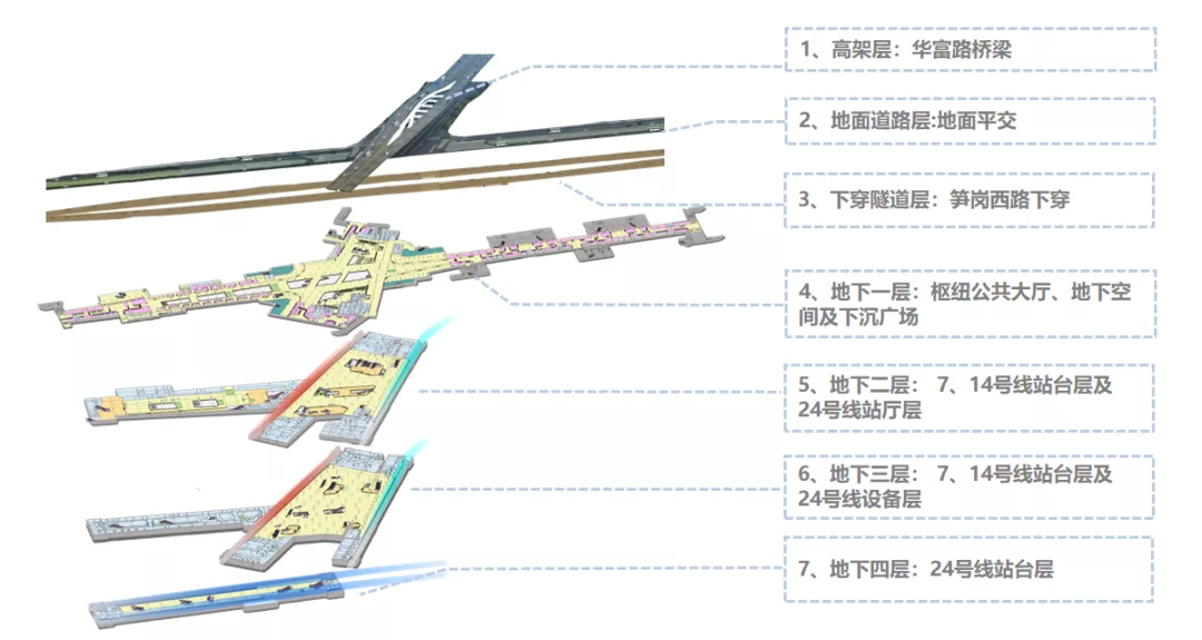 14号线(在建)沿华富路和泥岗西路地下敷设,为地下三层叠侧车站,与既有7号线同台换乘;