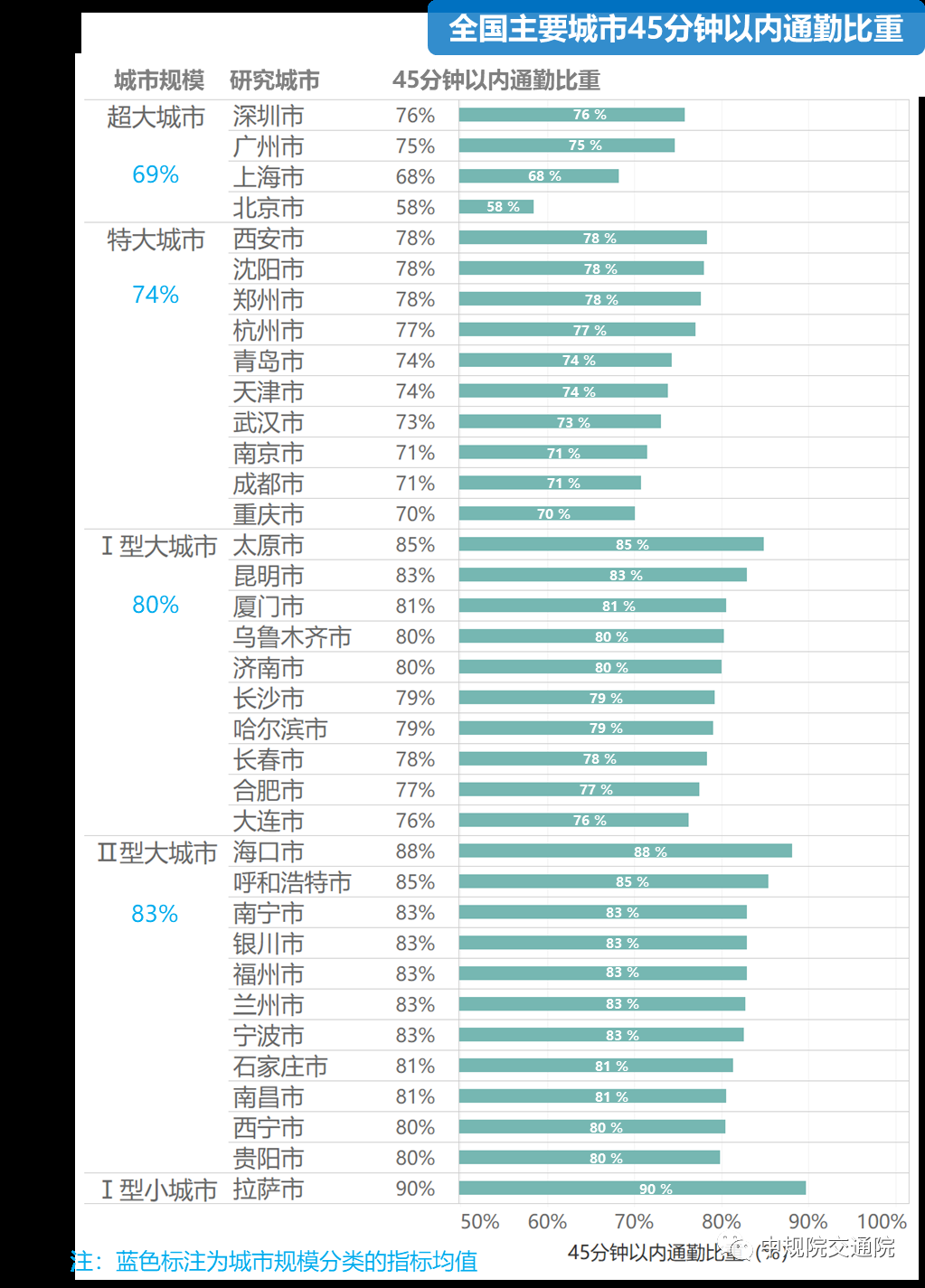 数据显示,在全国36个主要城市中,45分钟以内通勤人口比重76%。