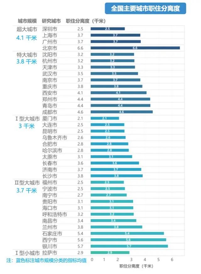 在超大城市中,北京的职住分离度最高,居民需要到离居住地6.6公里外的地方才能找到一份工作;而上海与广州需要3.7公里,深圳只需2.5公里。