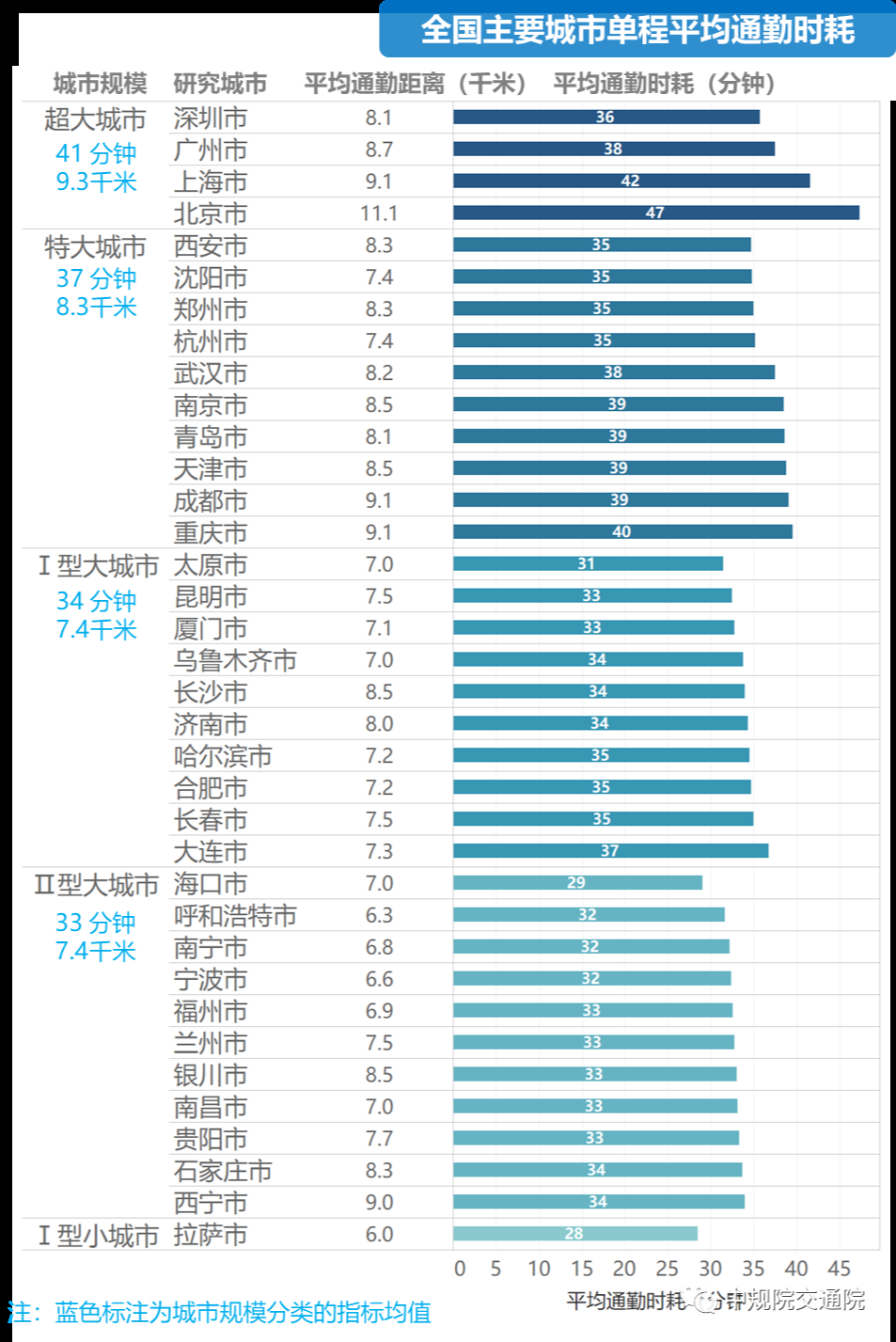 《报告》显示,36分钟是全国主要城市通勤人口的单程平均时耗。其中,超大城市平均通勤时耗41分钟,特大城市37分钟,Ⅰ、Ⅱ型大城市分别为34、33分钟。