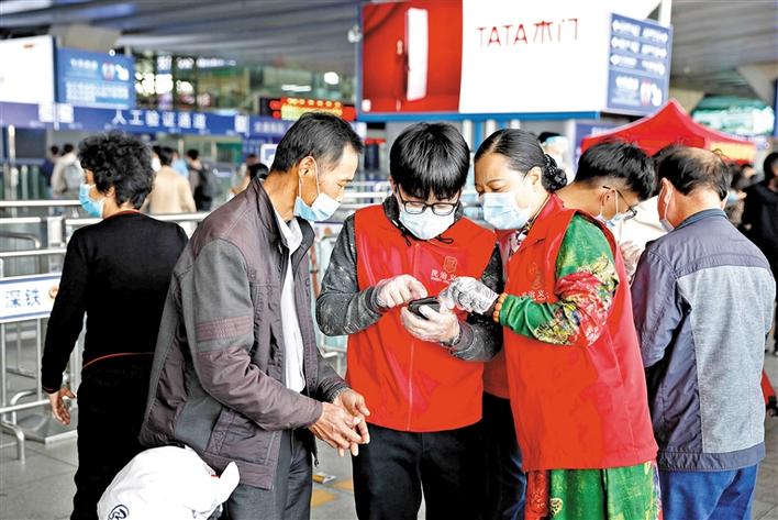 春运期间,民治义工在北站东广场进场口指导旅客查看健康码。