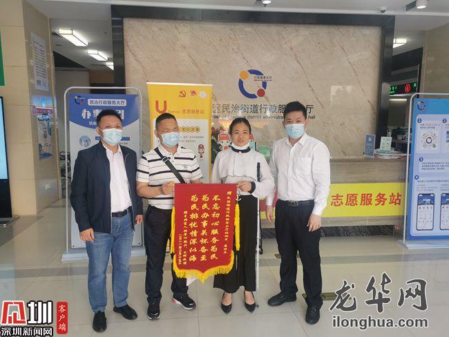 见圳客户端·深圳新闻网讯 (记者 陶倩)3月15日上午,视盲者朱小姐、何先生专程来到民治街道行政服务大厅,将一面写有“不忘初心为民服务”的锦旗亲手送到民治街道公共服务办(政务服务)负责人手中,感谢民治街道行政服务大厅给予他们的人性化服务。