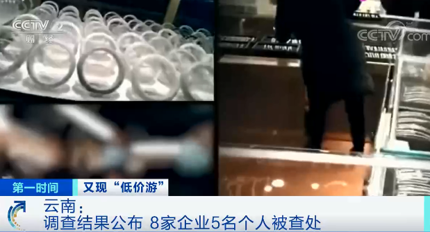 其中,涉事旅行社云南淘旅国际旅行社被处以五万元罚款;昆明市景怡旅行社有限公司、丽江御景旅行社被吊销旅行社业务经营许可证;别川假冒云南淘旅国际旅行社有限公司名义,未经许可经营旅行社业务,被没收违法所得并处十万元的行政处罚;昆明市景怡旅行社有限公司法定代表人白天娅、计调罗能被处两万元的行政处罚。涉事导游秦振威、胡军,被罚款两万元并吊销导游证。涉事购物店楚雄滇之叶茶文化艺术馆、玉龙县祥裕商贸有限公司、古城区超卓商行、古城区玉祥源商行、古城区捷顺药房被处以停业整顿30天,并将就是否存在其他违法违规行为接受进一步调查处理。