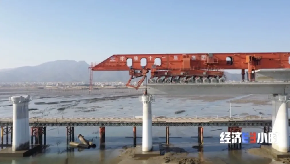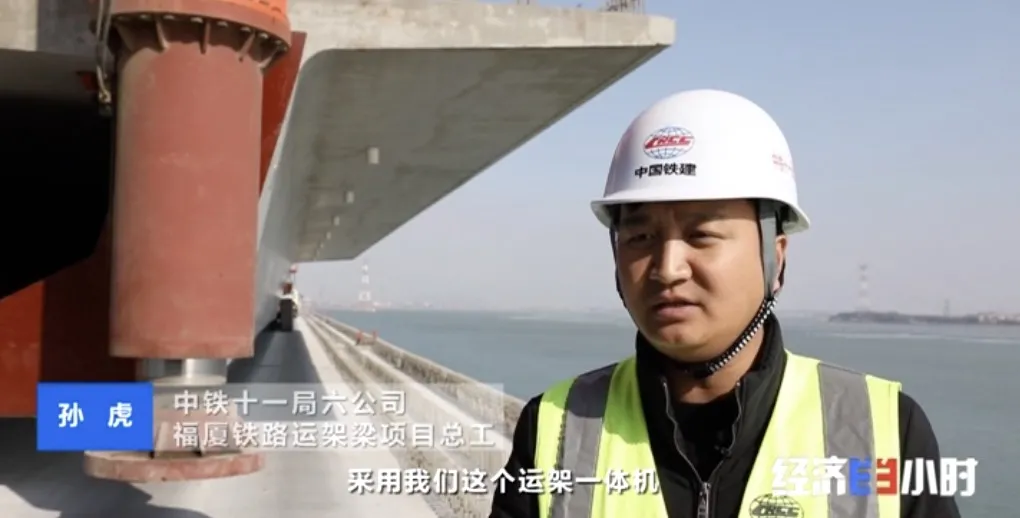 拥有自主研发的新材料、新工艺,桥梁施工的难题迎刃而解,在施工现场提梁机将箱梁从桥下“提”到桥上,运架一体机伸出长长的“手臂”,将“前脚”支撑在下一个桥墩上,然后,通过特制吊臂提起箱梁,将其稳妥地安放在两个桥墩之间。