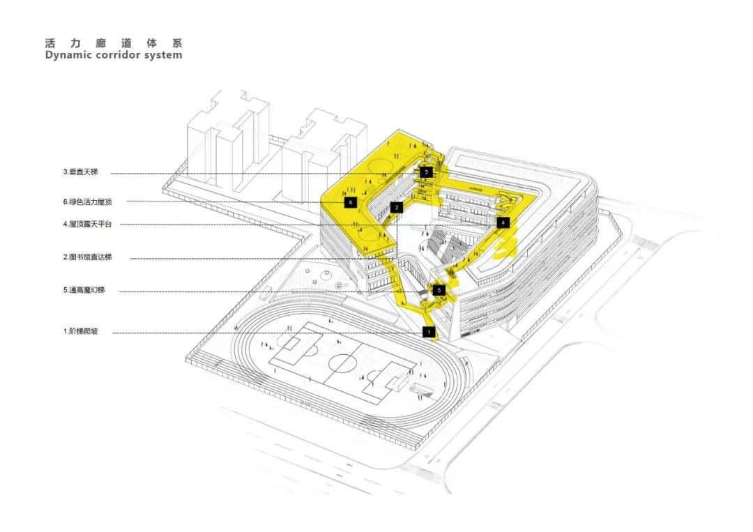 建筑引入了“活力廊道体系”,使建筑的垂直交通空间与屋顶和架空平台形成了通畅的连接。