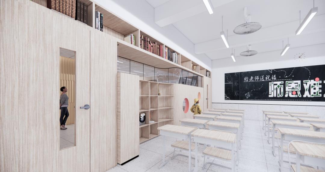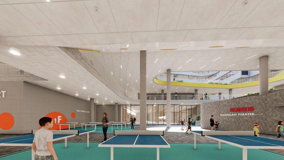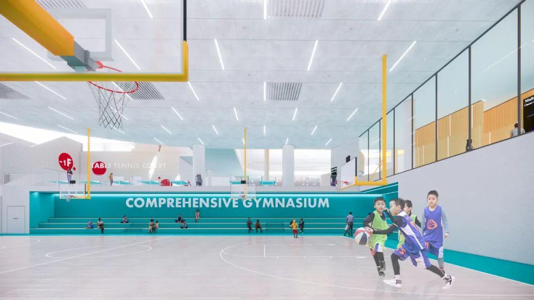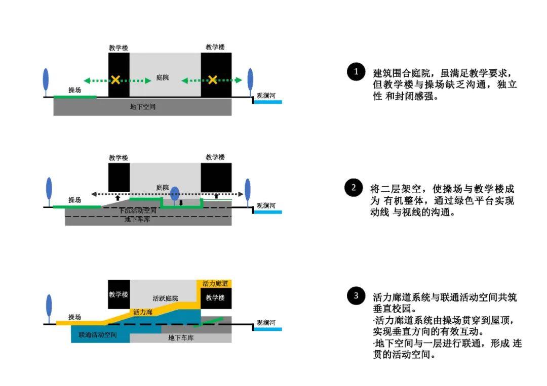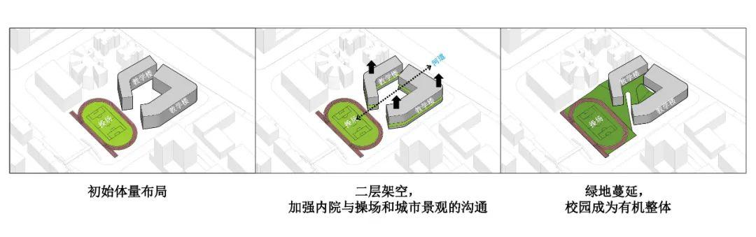 同时,建筑与操场的关系半开半合、若隐若现,使操场的“动”与建筑内庭院的“静”形成视线有所沟通、声音有所隔绝的“分区”,在保留学生学习区域安静的同时,视线上也能够观察到操场上所发生的事情,让学生的学习具有“城市感”。