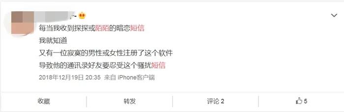 “每当我收到探探或陌陌的暗恋短信,我就知道又有一位寂寞的男性或女性注册了这个软件,导致他的通讯录好友要忍受这个骚扰短信。”还有网友称。