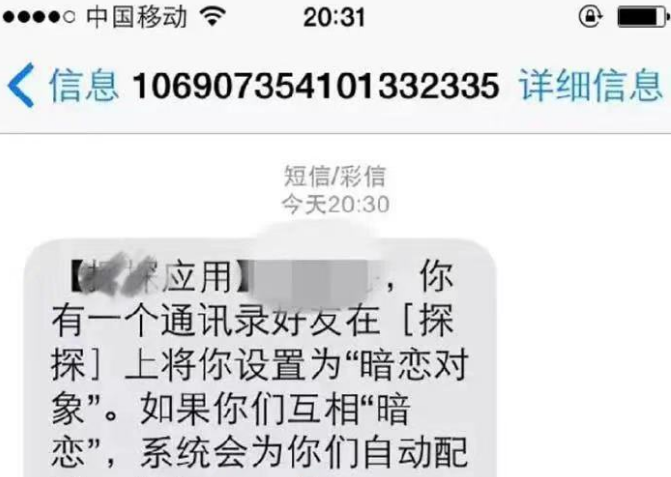 近日,不少用户向中新网记者反映,收到“可怕”的短信,“短信准确写到了我的真实姓名,并称有人将我设置为暗恋对象。实际上,我根本就没有注册过这个APP,如何设置我?但短信显示的又是我的真实姓名。”