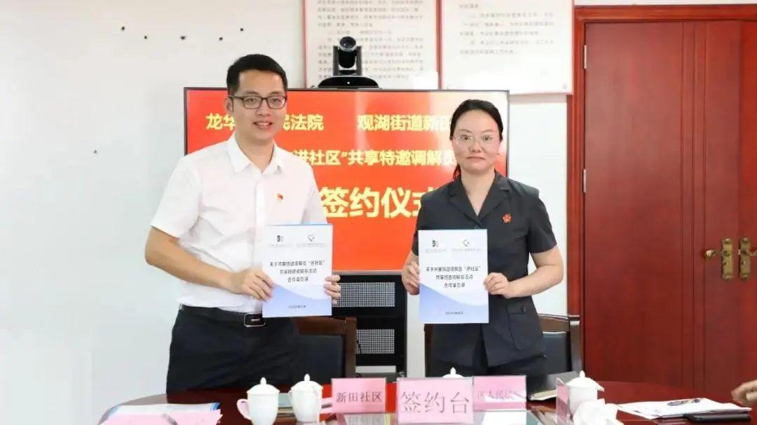 2020年6月18日,龙华法院走进观湖街道新田社区举办特邀调解员“进社区”、共享特邀调解员活动。龙华法院与新田社区签署了《关于开展特邀调解员“进社区”、共享特邀调解员活动的合作备忘录》,“共享”特邀调解员参与社区矛盾化解、调解宣传、法治宣传等工作。