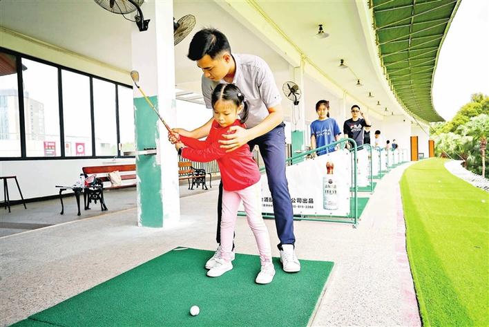 在高尔夫公益培训课堂,学员们在高尔夫球教练的指导下学习如何挥杆。