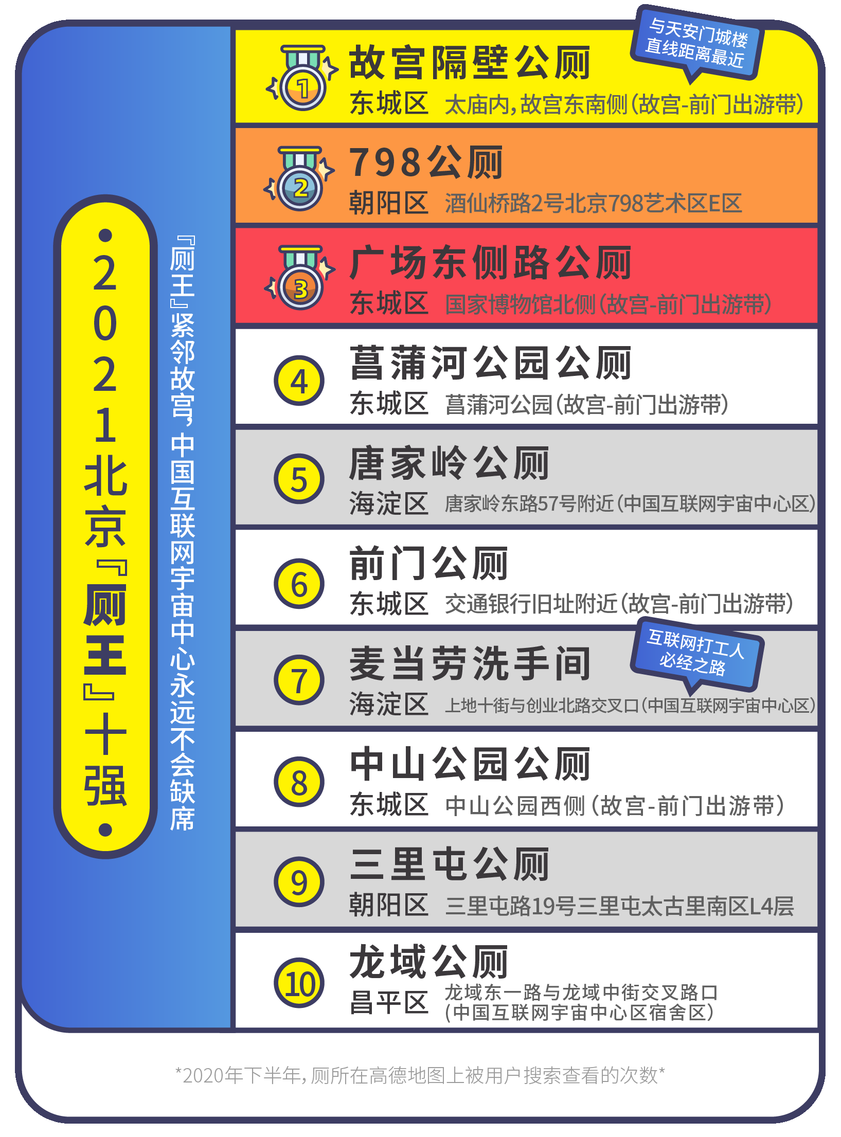 北京的“厕王”位于故宫东南侧的太庙内,是直线距离天安门城楼最近的公厕。厕王榜眼位于798艺术区E区内。厕王探花位于广场东侧路国家博物馆北侧,第四名位于菖蒲河公园,第六名位于前门,第八名位于中山公园,都在天安门广场及前门一带。厕王第五名、第七名、第十名位于互联网大厂云集的西二旗-后厂村一带,其中,第七名为西二旗地铁站对面的麦当劳上地十街店洗手间,是互联网打工人上下班的必经之路。