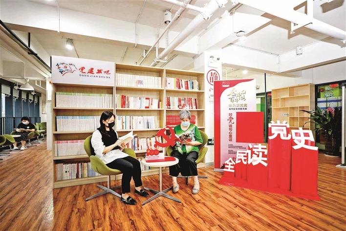 市民在清湖社区党群服务中心党建书吧阅读党史书籍。