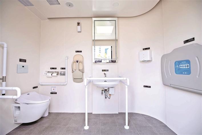 为满足不同群体的使用需求,小型街头公厕内还配有婴儿护理台、婴儿座椅、无障碍扶手、卫生收纳袋、USB充电接口等便捷设施。更为人性化的是,厕所内部空间与设施安装充分考虑轮椅使用者的需求,触手可及的洁具、充裕的回转空间为轮椅使用者带来更好的体验,紧急呼叫按钮和紧急联系人电话可让如厕者在必要时求助呼救,为市民提供更具科技范和舒适度的“方便”之地。