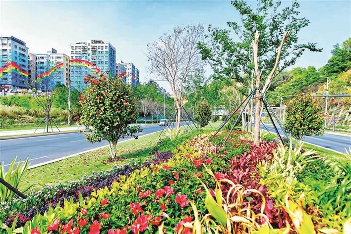 行走在龙华大道清龙路至景龙建设路段,鲜艳多彩的中间带花境格外“吸睛”,鸡蛋花、小叶紫薇、美人蕉、银边草、剑麻等植物组团配置,并镶嵌置石进行搭配,营造出绿意盎然、五彩缤纷的街头景观。在五和大道道路中间带上,连绵的黄花风铃木迎风盛放,为市民“绣”出一条赏心悦目的“金黄之路”。