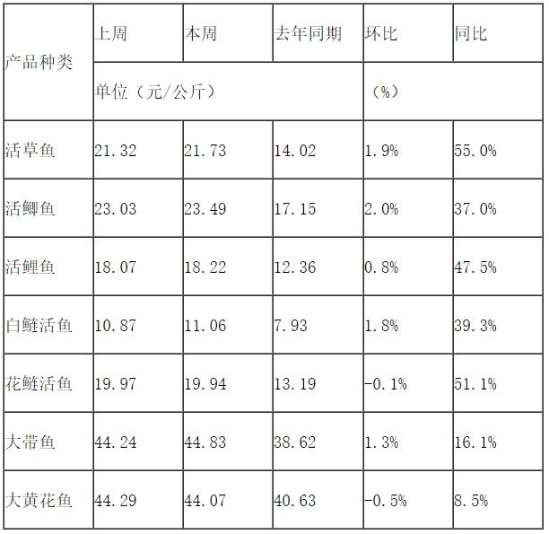 从同比看,除了大带鱼、大黄花鱼,其他鱼种同比均大幅上涨。如,草鱼周平均价格21.73元/公斤,同比上涨55.0%;花鲢鱼周平均价格19.94元/公斤,同比上涨51.1%;鲤鱼周平均价格18.22元/公斤,同比上涨47.5%。