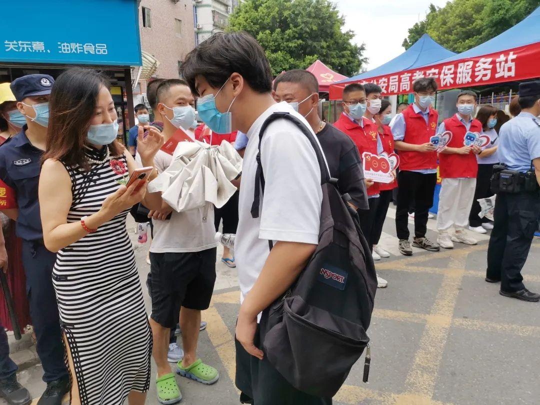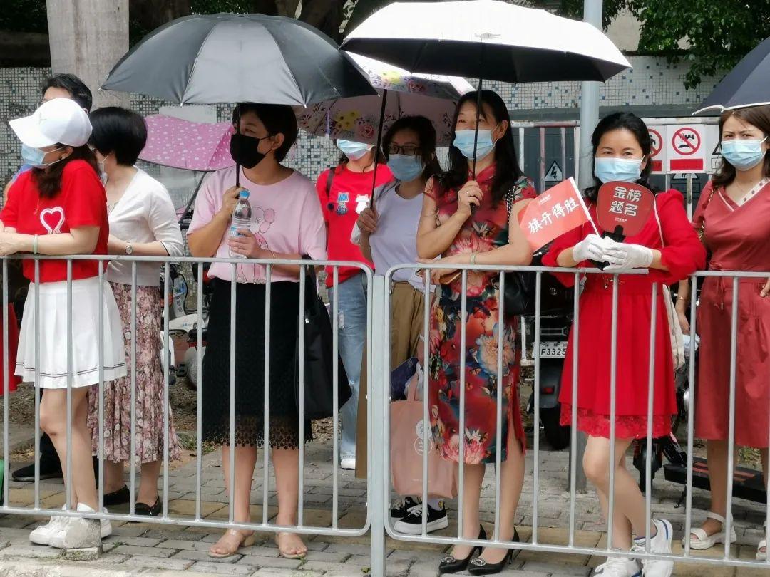 龙华中学老师身穿红色上衣为考生打气加油。