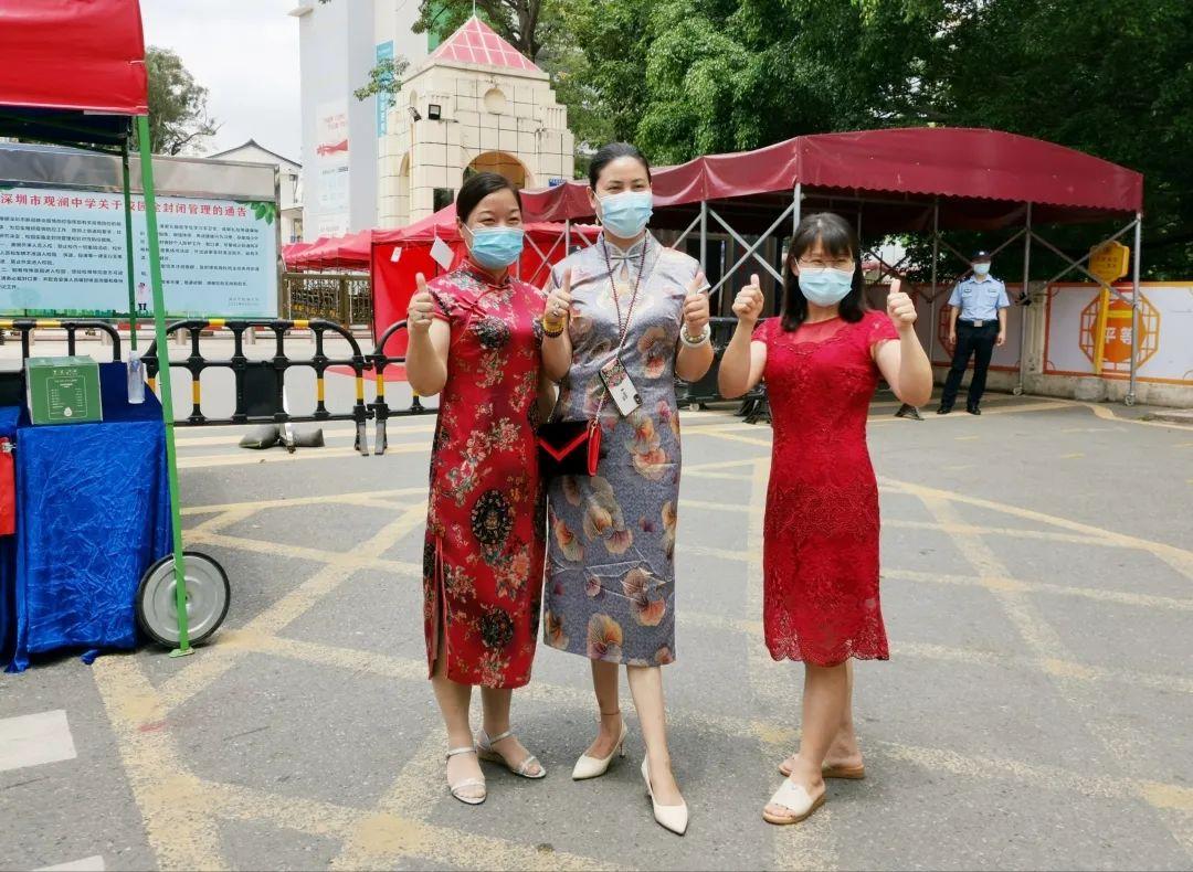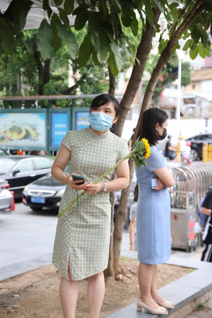 身着旗袍的家长为考生打气加油,祝愿旗开得胜。