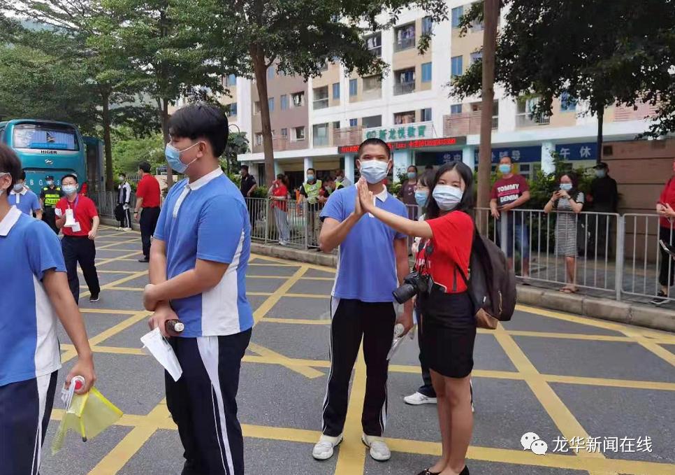 龙华中学老师身穿红色上衣与考生击掌。