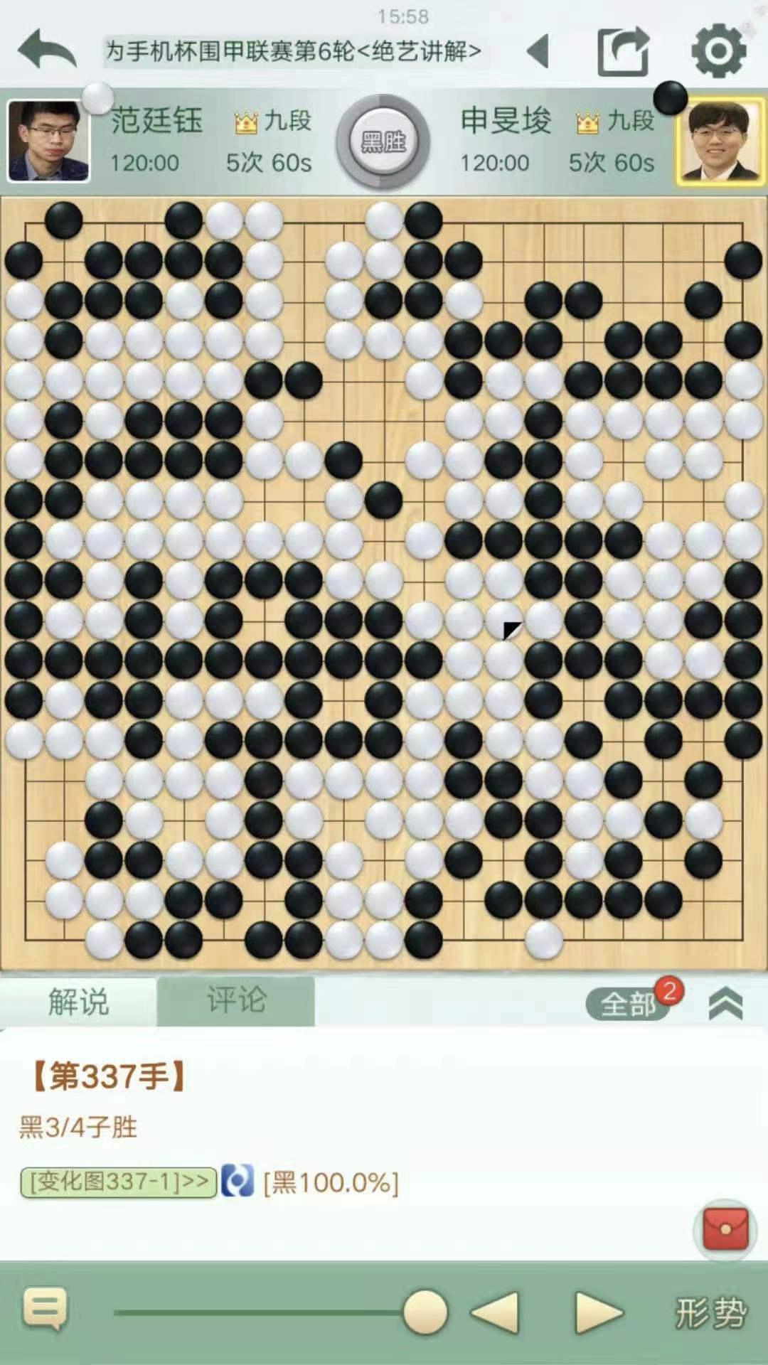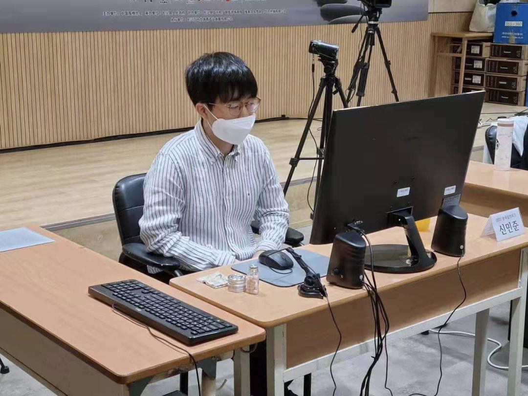 龙华队韩国外援申旻俊,是此战唯一为本队得分的。他执黑对阵世界冠军范廷钰,开局下白攻击手法不当,黑处理好后局面领先。中盘黑计算精准,下出绝妙手段,在白空里出棋,优势扩大。之后黑稳扎稳打将优势保持至终局。