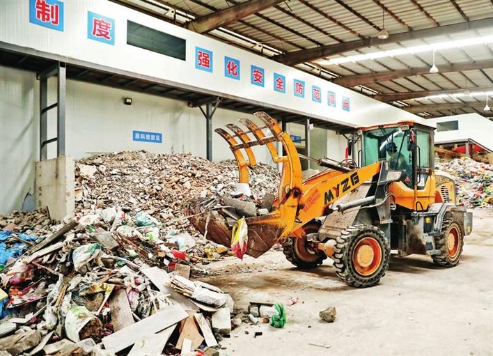 在装修垃圾专项处理点,工作人员操作铲车对装修垃圾进行初步分拣。