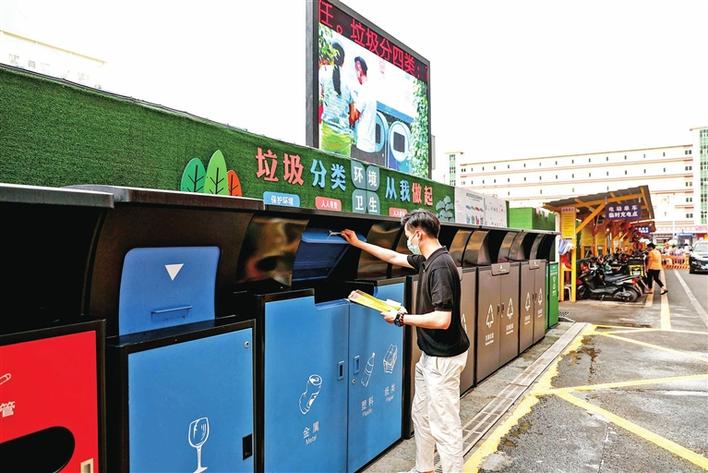 在福城章阁社区澳门小区生活垃圾收集点,居民分类投放生活垃圾。