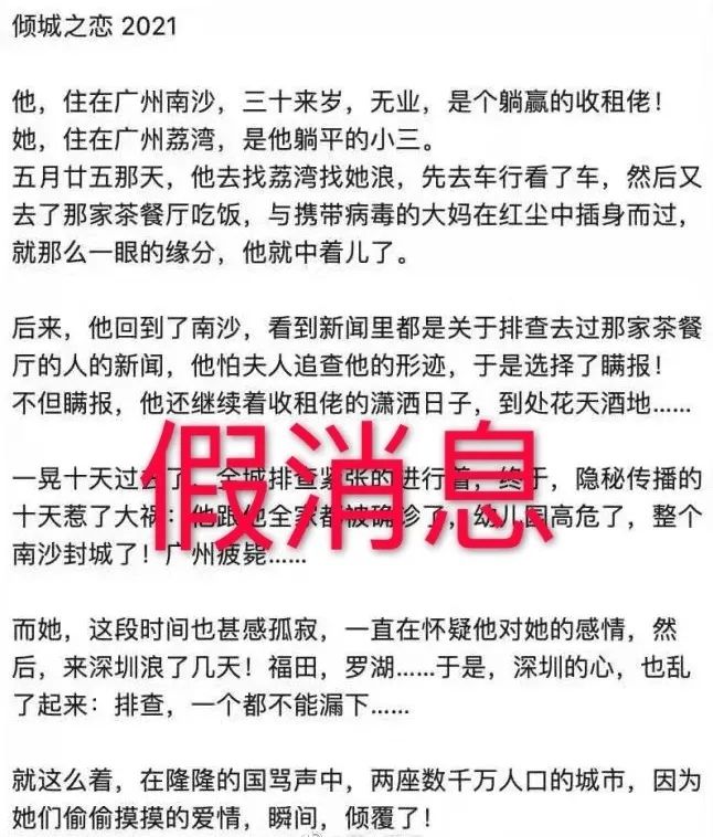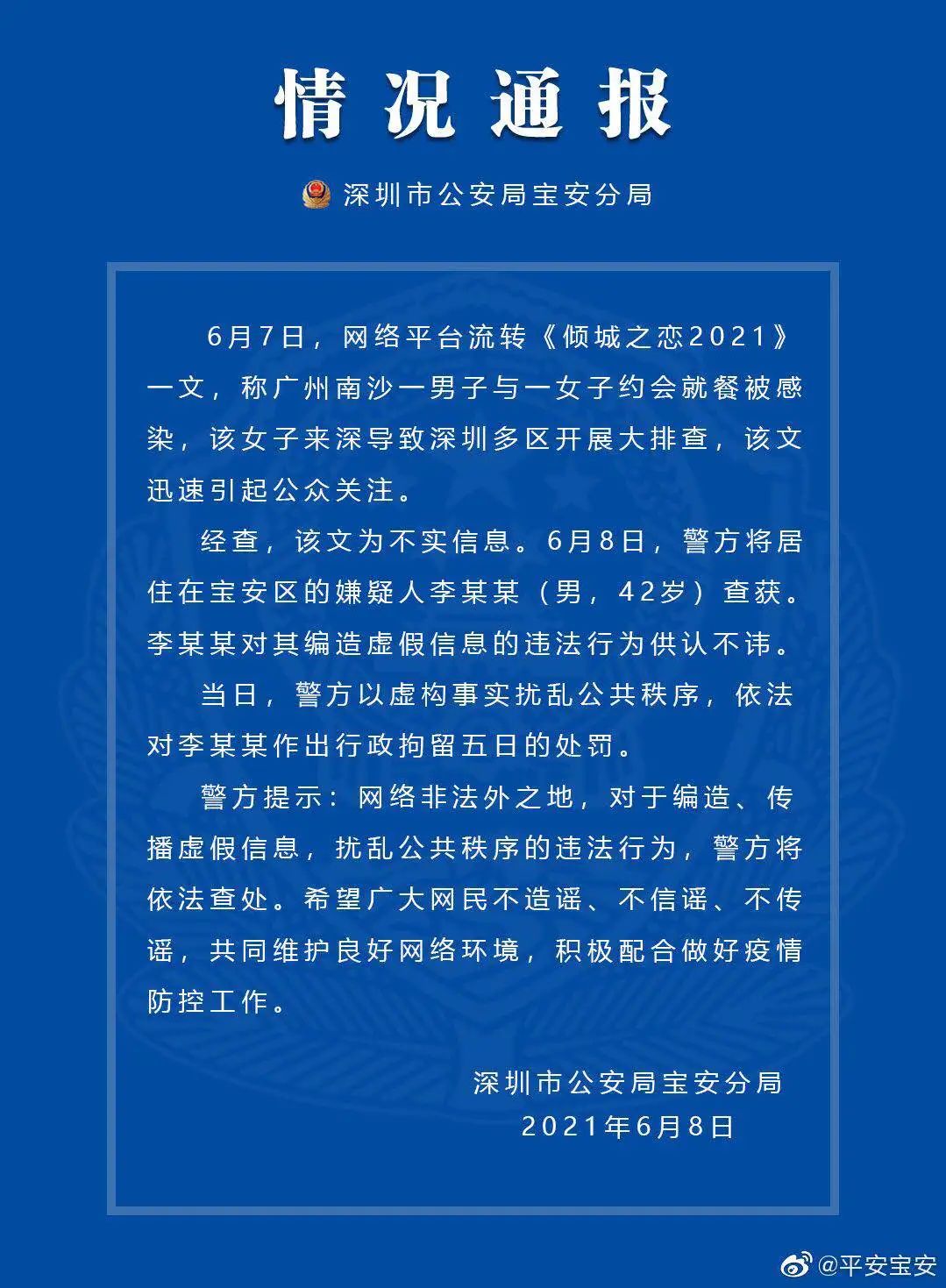 据深圳市公安局宝安分局@平安宝安情况通报:6月7日,网络平台流转《倾城之恋2021》一文,称广州南沙一男子与一女子约会就餐被感染,该女子来深导致深圳多区开展大排查,该文迅速引起公众关注。