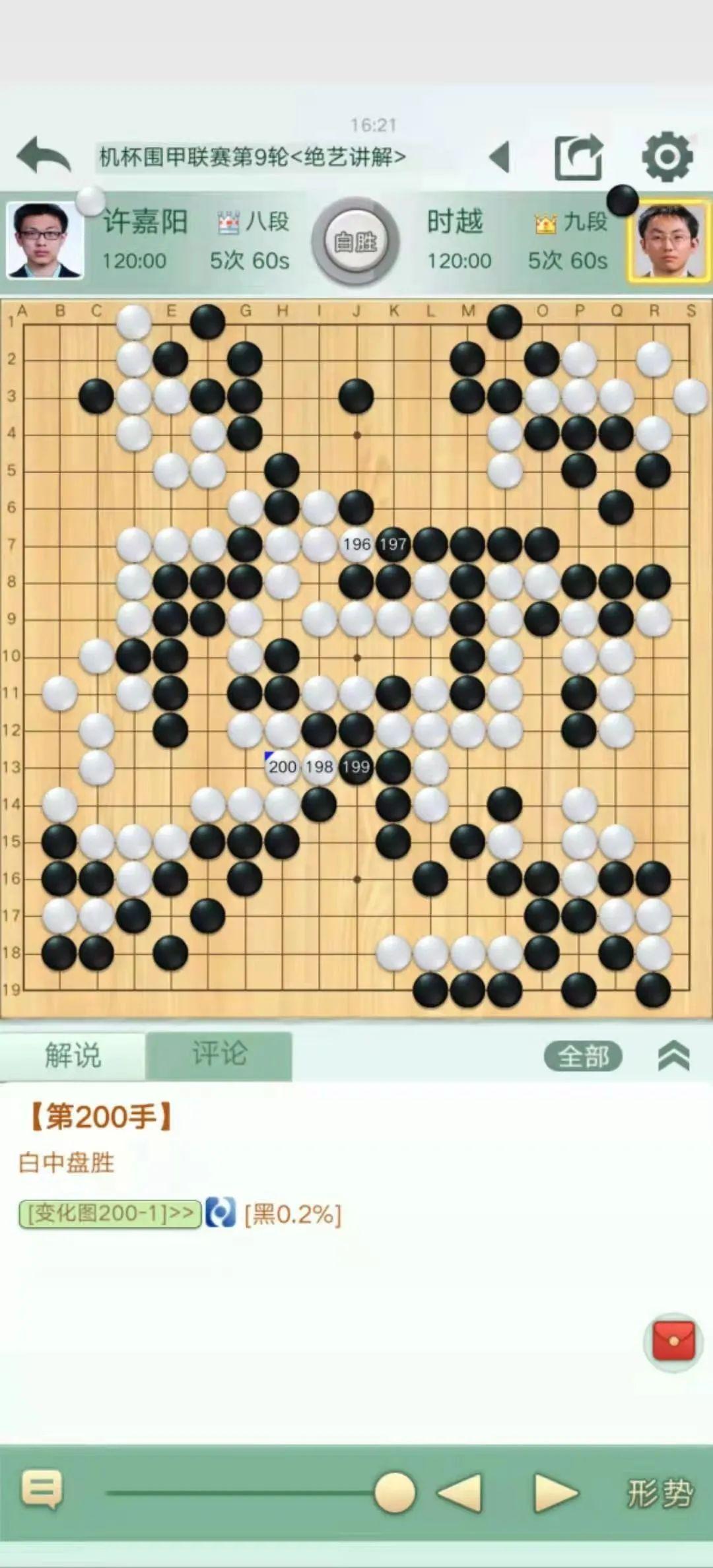 等级分排名15的时越执黑对阵排名14的许嘉阳。黑棋开局行棋有些平缓,慢慢推进。但之后白棋发挥上佳,黑棋没有明显机会,最终落败。