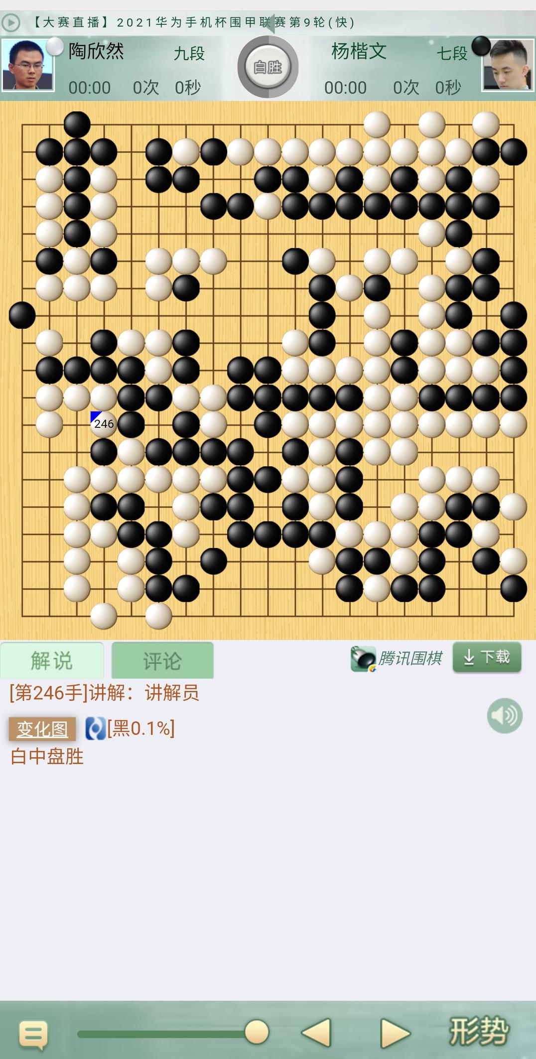 快棋赛陶欣然执白对阵等级分排名29位的杨楷文。开局右边黑棋冲击白棋将白分断,但是由于棋形没有下对,用来断开白棋的棋筋反而被吃,白棋早早进入胜势。